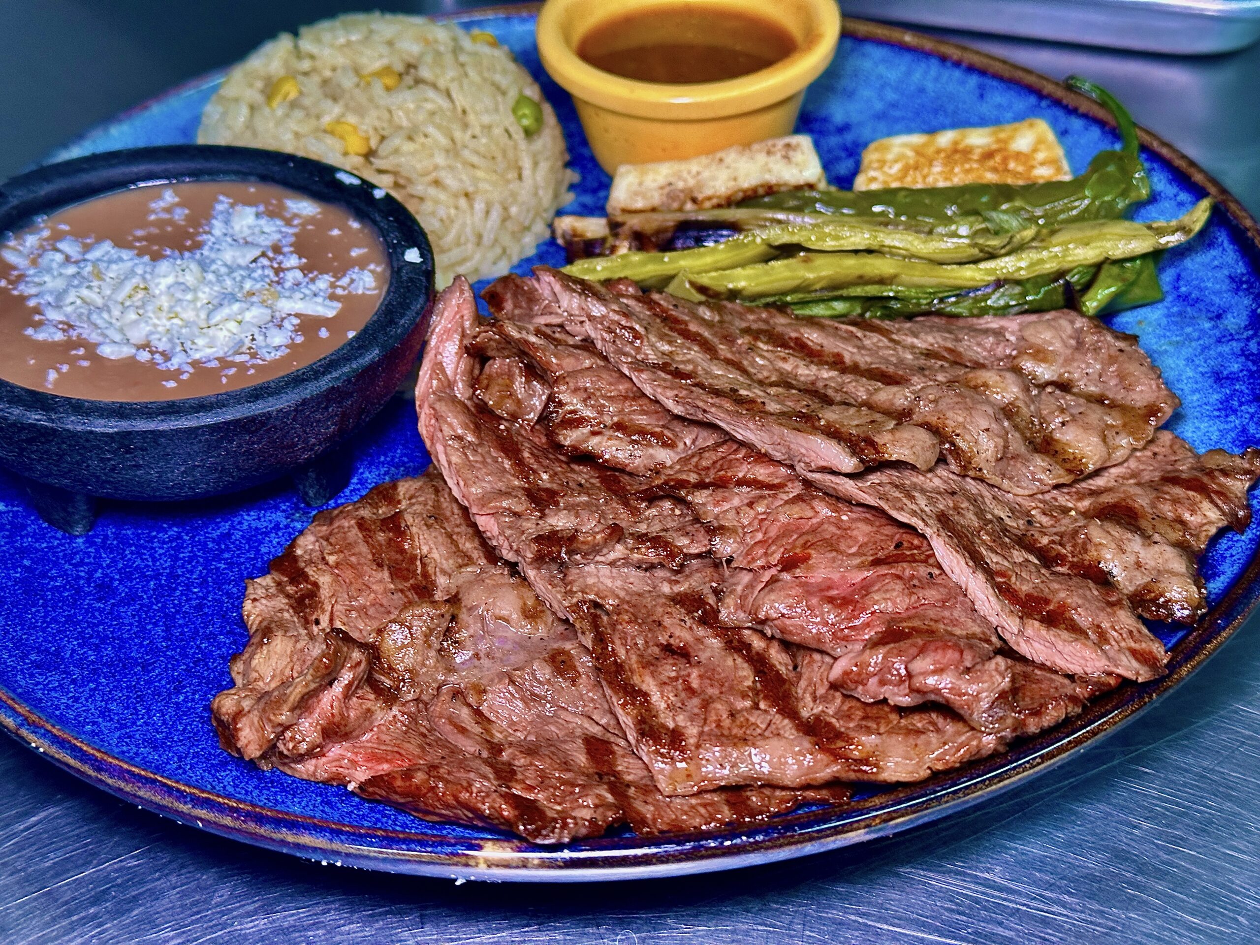 Our grilled beef is perfectly seasoned and served with a colorful of bell peppers, onions, and tomatoes. And don't forget about the classic side of rice and beans that will complete your meal.